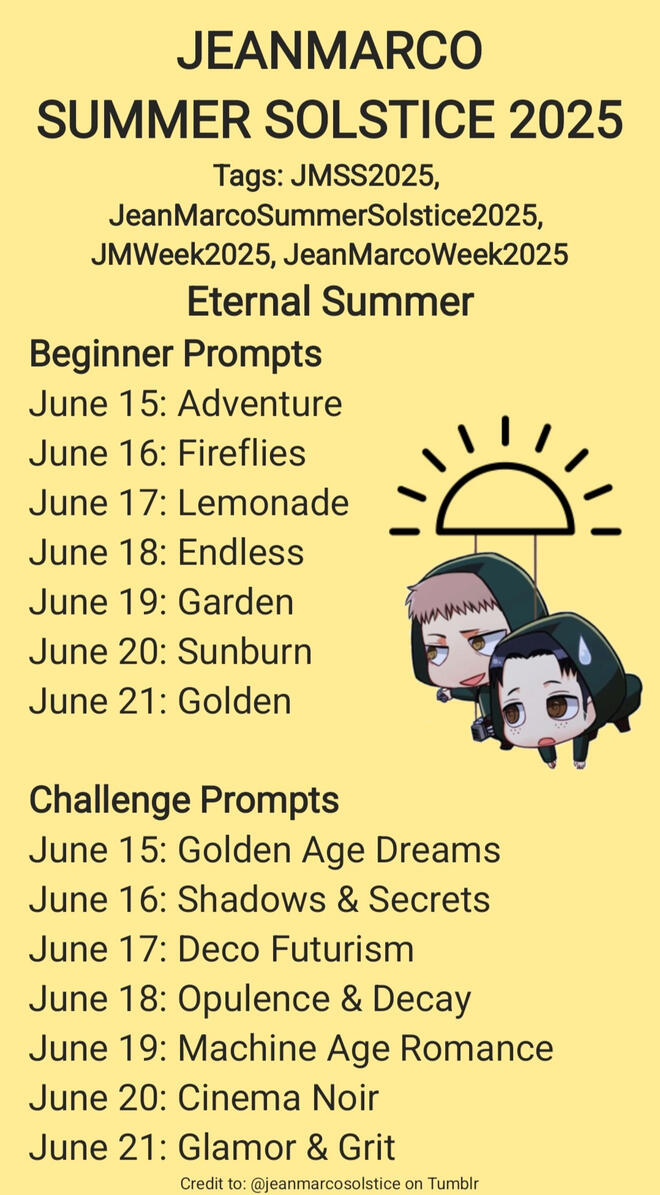 Problematic behaviors will not be tolerated. This includes but is not limited to: bullying, racism, homophobia, and transphobia. Please be respectful to one another.Tag content appropriately. There will be a separate tag for each solstice event, and an overall yearly tag. The main tag for any given JM Solstice will NOT be for explicit works. There will be a specific tag reserved for these works. I personally recommend posting NSFW content, especially visual art, to Bluesky or Twitter/X.Please do whatever you want to make this JeanMarco event fun and accessible! The prompt lists serve as a flexible guide. That means you may skip a prompt if you don't like it, mix up prompts from multiple days, or come up with your own idea: you are free to do as you please. The dates are also trivial: prompts may be posted out of order, posts can be made late/early, and you could also only post for a few days or just one day of the event. Make this event your own.Please do not reach out to the admin excessively. I will do my best to reply to JM Solstice specific questions. I did not create this event to make friends and will not use this blog for personal reasons. This blog is for promoting and discussing fan-made JeanMarco content.These rules are subject to change.