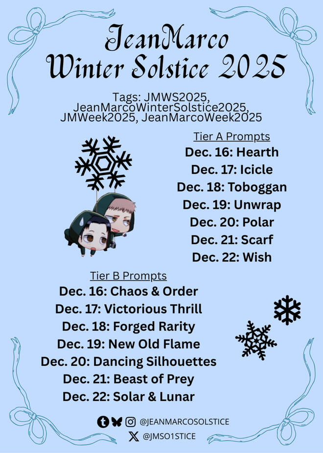 The 2025 JeanMarco Winter Solstice will begin Tuesday, December 16th and conclude Monday, December 22nd.Any and all JeanMarco content is welcome! Examples include but are not limited to: drawings, animations, fanfiction, cosplay, video edits, and song playlists.Early and late posts are allowed, and the prompts serve as a flexible guide.Feel free to save the prompt list image to repost on different platforms with proper credit.Mature content is allowed and should be tagged appropriately. "AtNight" should be added to the main tags. Examples: JMWS2025AtNight or JMWeek2025AtNight. I personally recommend posting NSFW content, especially visual art, to Bluesky or Twitter/X.